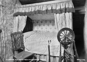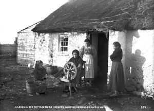 A LOUGHSHORE COTTAGE NEAR MAGHERY, WINDING BOBBINS ON AN OLD WHEEL
