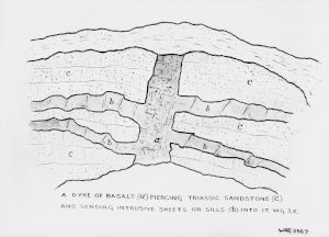 A DYKE OF BASALT(a) PIERCING TRIASSIC SANDSTONE(C)  AND SENDING INTRUSIVE SHEETS OR SILLS(b) INTO IT