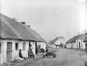 - Glynn village showing group of people outside thatched houses with one woman at spinning wheel.