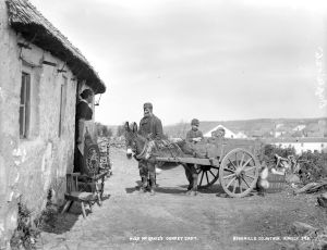 - Hugh McGahie and his donkey and cart outside a thatched house