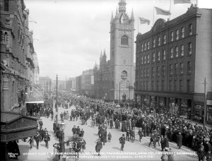 - View northwards from corner of Glengall Street, showing County Down Unionist clubs marching to Unionist demonstration at Balmoral, 9 April 1912.