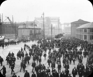 - subject : Lantern slide series 'History of Shipbuilding'. as Y:13189 but entitled 'The rush home of workers from the biggest shipyard in the world' see also W10/46/44