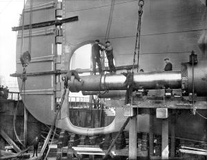 - subject : view of workmen putting in the tail shaft on the 'Olympic';not an original Welch print