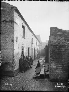 - subject : A group of children stand in a line outside one of the old houses off Gardiner Street, lower Shankill area. Two women standing at the front door of a house further down look on as the photographer takes his picture. date : 1912-03-09