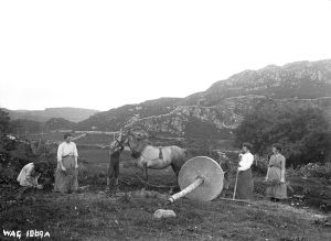 - Women working upland field pulling a lint wheel over flax with horse plus two girls and a lad